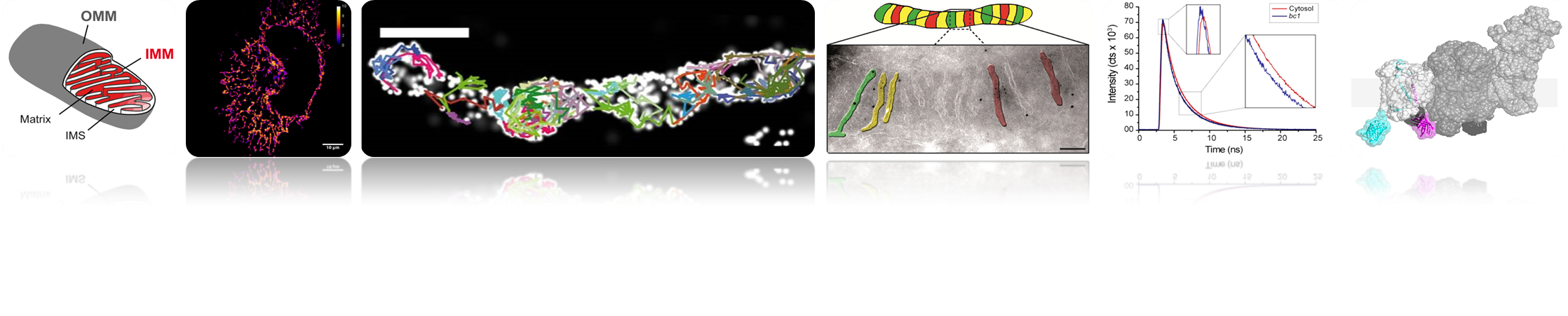 We study mitochondria in live mammalian cells with diverse advanced microscopic methods. To determine function on the mitochondrial level in situ, we continuously develop and refine fluorescent reporter systems for high and superresolution imaging. Different transgenic cell lines are used to investigate basic mitochondrial morpho-functional interrelations and the overall significance of organelle and protein dynamics. The spatio-temporal organization of OXPHOS complexes is addressed by dual color superresolution fluorescence and immuno-electron microscopy. We currently set up correlative microscopy as well.